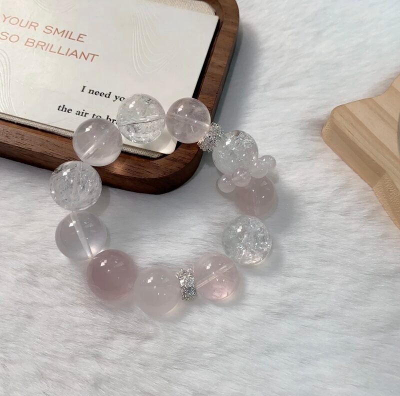 Wear the bracelet on one hand only to avoid stacking with other jewelry that could scratch its surface; remove it before applying hand cream or perfume to prevent chemical damage; take it off at bedtime, wipe gently with a soft cloth, then store in a dry, dark place; remove promptly before bathing or swimming to avoid long-term water exposure; if the luster fades after regular wear, rinse gently with room-temperature water and pat dry with a soft cloth; keep it separate from metal or high-hardness jewelry to prevent scratches. May the purifying energy of clear quartz and the gentle energy of rose quartz always accompany you, bringing a clear state of mind and warm, positive blessings.