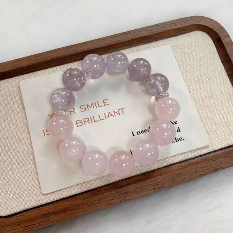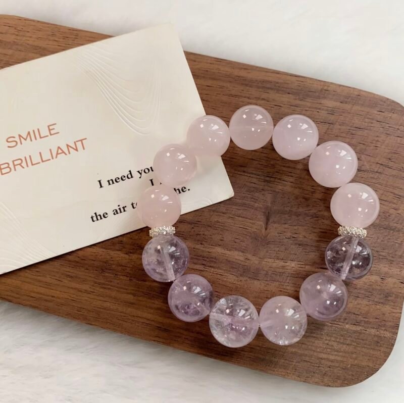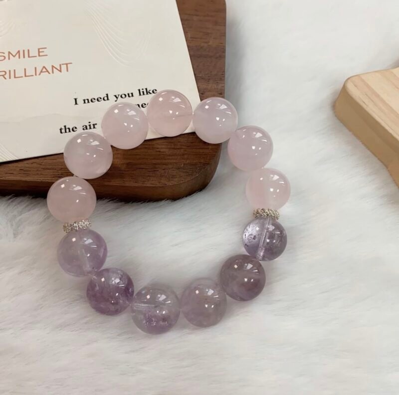 Both amethyst and rose quartz are receptive crystals, so it’s recommended to wear them on your left hand to better absorb positive energy. Remove them when bathing or coming into contact with chemicals like perfume and skincare products to prevent scratching, corrosion, or loss of luster. Avoid exposing both to direct sunlight and high-temperature environments, as this can damage their internal structure. Purify and recharge them by placing them under the full moon for 4–8 hours monthly or using a crystal cluster. Store them separately in a soft pouch or jewelry box when not wearing to avoid scratches from friction with other hard objects, and try not to let others touch them casually to prevent disrupting your own energy field.